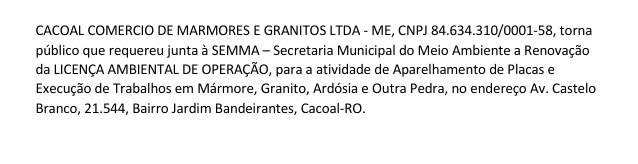 CACOAL COMERCIO DE MARMORES E GRANITOS LTDA – ME – LICENÇA AMBIENTAL DE OPERAÇÃO Por Diretor Chefe 4 de dezembro de 2025 às 15h12