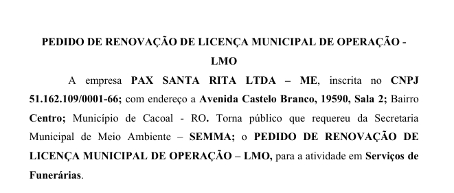 PEDIDO DE RENOVAÇÃO DE LICENÇA MUNICIPAL DE OPERAÇÃO – LMO A – PAX SANTA RITA LTDA – ME Por Diretor Chefe 2 de dezembro de 2025 às 12h57