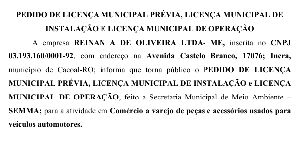 PEDIDO DE LICENÇA MUNICIPAL PRÉVIA, LICENÇA MUNICIPAL DE INSTALAÇÃO E LICENÇA MUNICIPAL DE OPERAÇÃO REINAN A DE OLIVEIRA LTDA- ME Por Diretor Chefe 5 de dezembro de 2025 às 12h22