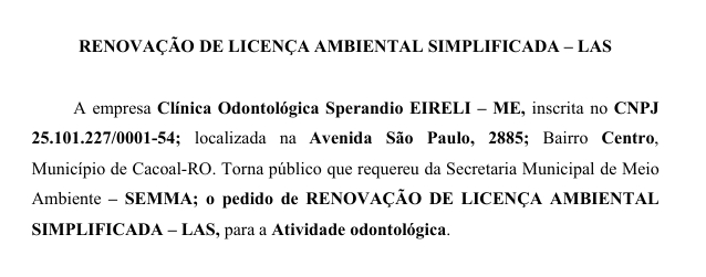 RENOVAÇÃO DE LICENÇA AMBIENTAL SIMPLIFICADA – LAS CLÍNICA ODONTOLÓGICA SPERANDIO EIRELI – ME Por Diretor Chefe 4 de dezembro de 2025 às 10h09