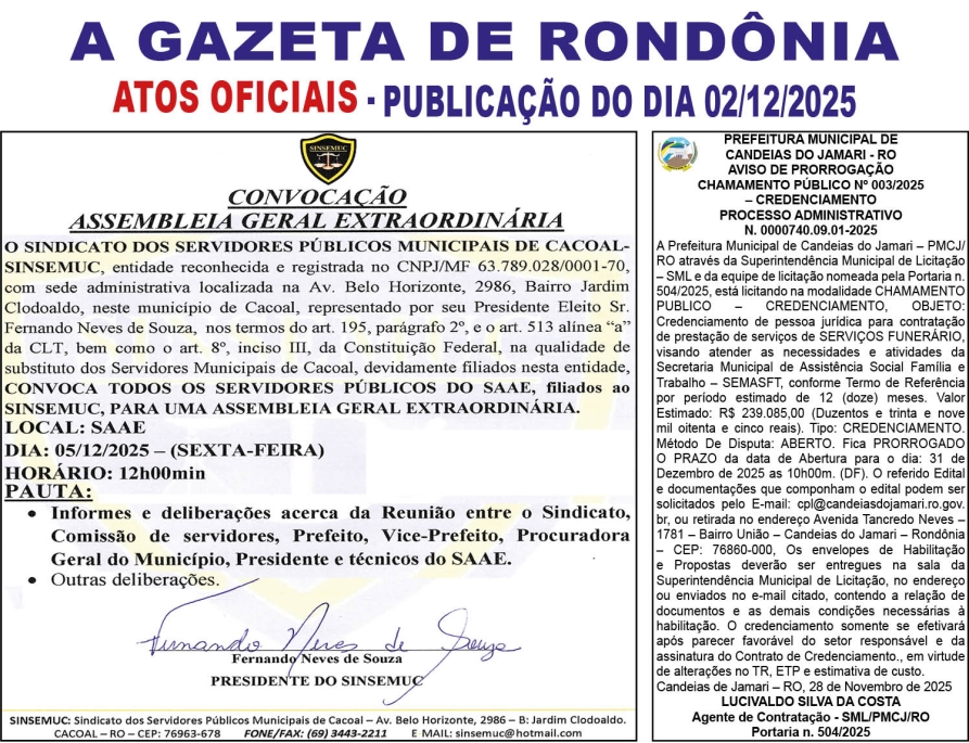 A GAZETA DE RONDÔNIA ATOS OFICIAIS PUBLICAÇÃO DO DIA 02/12/2025 Por Diretor Chefe 2 de dezembro de 2025 às 06h51