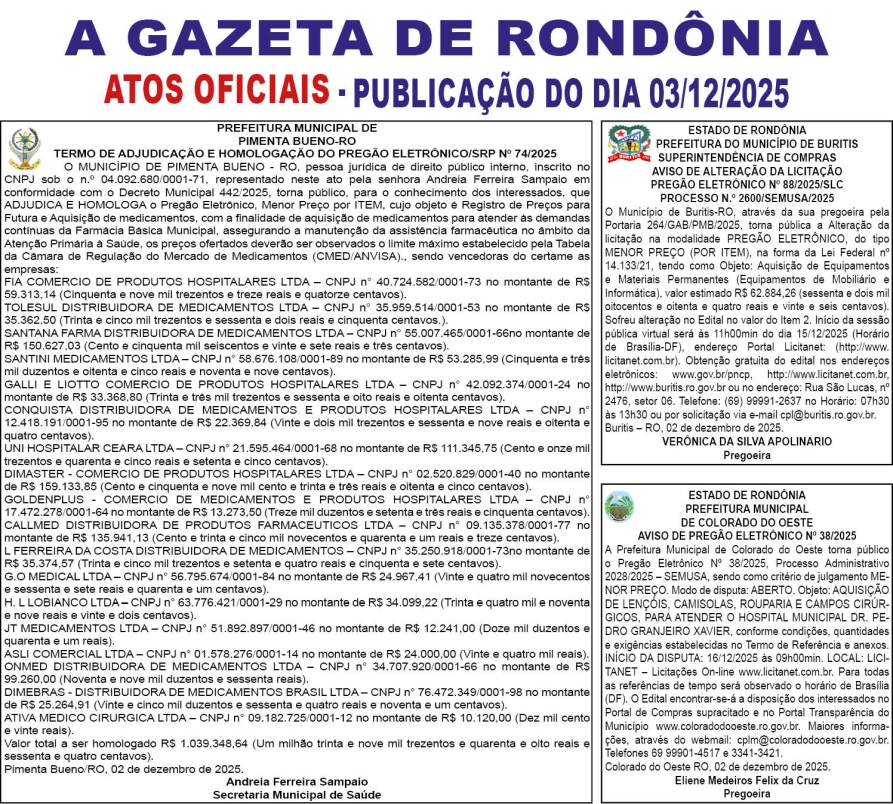 A GAZETA DE RONDÔNIA ATOS OFICIAIS PUBLICAÇÃO DO DIA 03/12/2025 Por Diretor Chefe 2 de dezembro de 2025 às 17h29