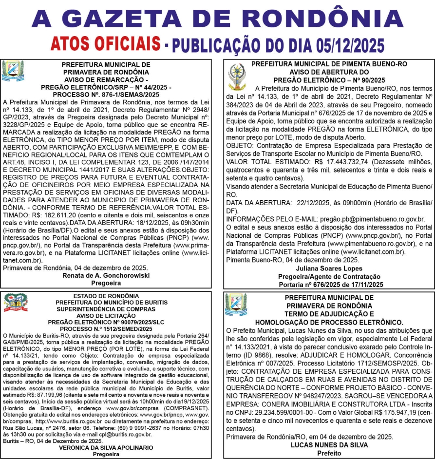 A GAZETA DE RONDÔNIA ATOS OFICIAIS PUBLICAÇÃO DO DIA 05/12/2025 Por Diretor Chefe 4 de dezembro de 2025 às 17h50