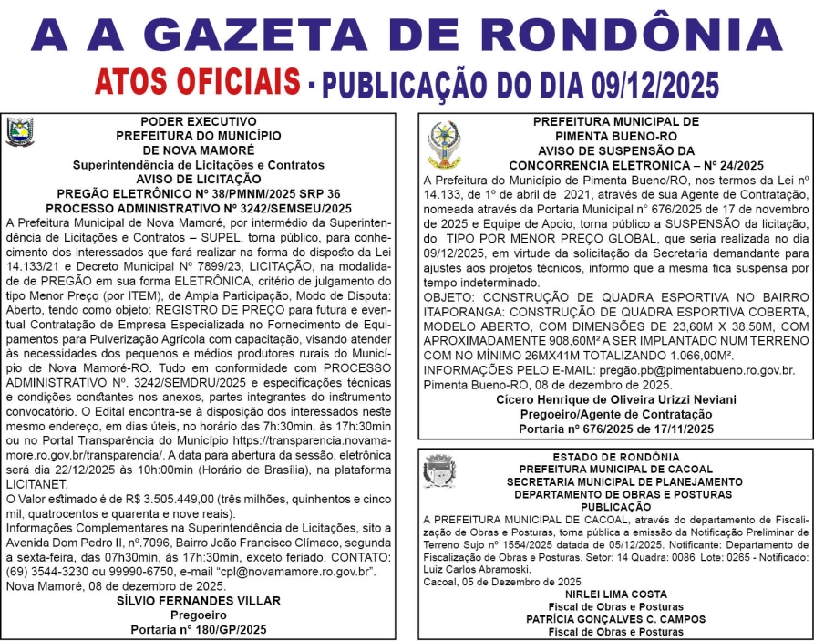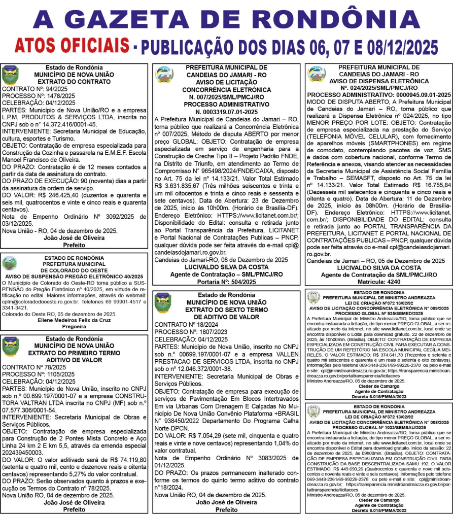 A GAZETA DE RONDÔNIA ATOS OFICIAIS PUBLICAÇÃO DOS DIAS 06, 07 E 08/12/2025 Por Diretor Chefe 5 de dezembro de 2025 às 17h26