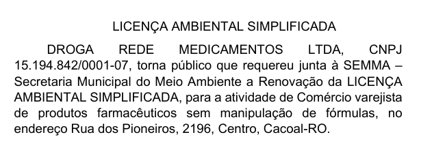 LICENÇA AMBIENTAL SIMPLIFICADA DROGA REDE MEDICAMENTOS LTDA Por Diretor Chefe 10 de fevereiro de 2026 às 17h01