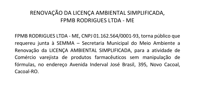 RENOVAÇÃO DA LICENÇA AMBIENTAL SIMPLIFICADA, FPMB RODRIGUES LTDA – ME Por Diretor Chefe 5 de fevereiro de 2026 às 17h29