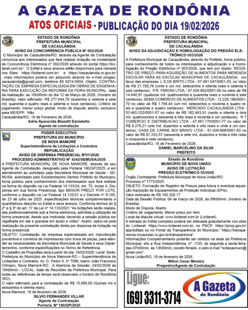 A GAZETA DE RONDÔNIA ATOS OFICIAIS PUBLICAÇÃO DO DIA 19/02/2026 Por Diretor Chefe 18 de fevereiro de 2026 às 17h32