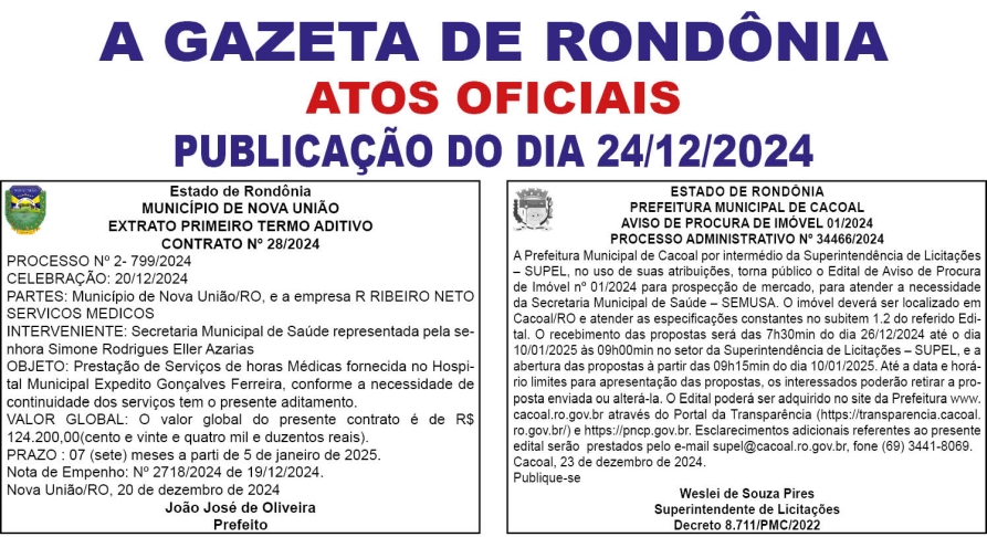 A GAZETA DE RONDÔNIA ATOS OFICIAIS PUBLICAÇÃO DOS DIAS 28, 29 E 30/12/2024 Por Diretor Chefe 27 de dezembro de 2024 às 16h28