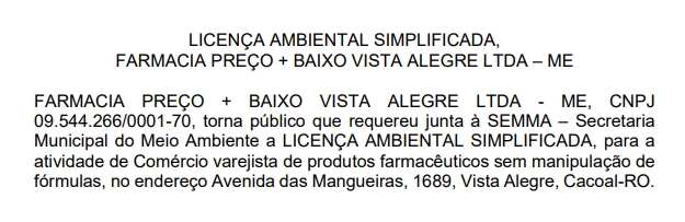 Licença Ambiental simplificada – Farmácia + Baixo Vista Alegre – ME Por Diretor Chefe 6 de dezembro de 2024 às 10h30