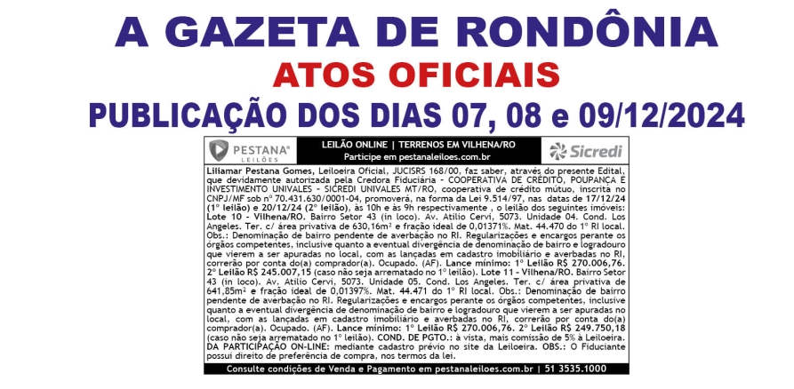 A GAZETA DE RONDÔNIA ATOS OFICIAIS PUBLICAÇÃO DOS DIAS 07, 08 E 09/12/2024 Por Diretor Chefe 6 de dezembro de 2024 às 16h49