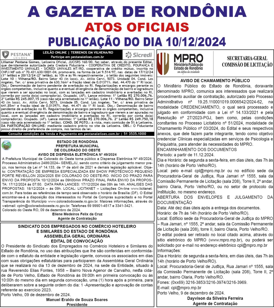 A GAZETA DE RONDÔNIA ATOS OFICIAIS PUBLICAÇÃO DO DIA 10/12/2024 Por Diretor Chefe 9 de dezembro de 2024 às 16h55