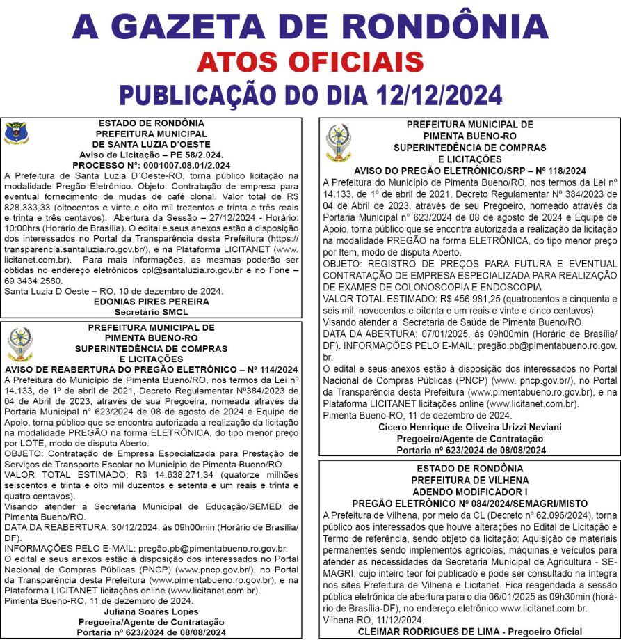 A GAZETA DE RONDÔNIA ATOS OFICIAIS PUBLICAÇÃO DO DIA 12/12/2024 Por Diretor Chefe 11 de dezembro de 2024 às 16h06