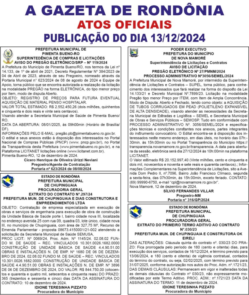 A GAZETA DE RONDÔNIA ATOS OFICIAIS PUBLICAÇÃO DO DIA 13/12/2024 Por Diretor Chefe 13 de dezembro de 2024 às 16h42