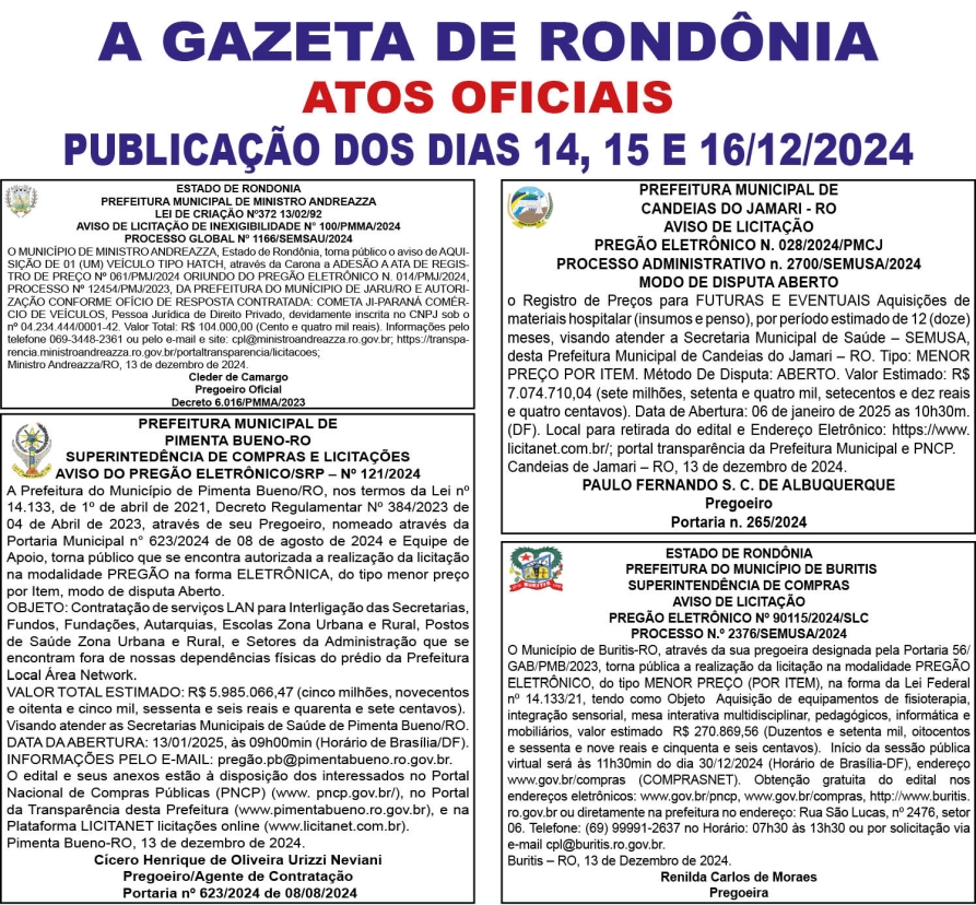 A GAZETA DE RONDÔNIA ATOS OFICIAIS PUBLICAÇÃO DOS DIAS 14, 15 E 16/12/2024 Por Diretor Chefe 13 de dezembro de 2024 às 16h44