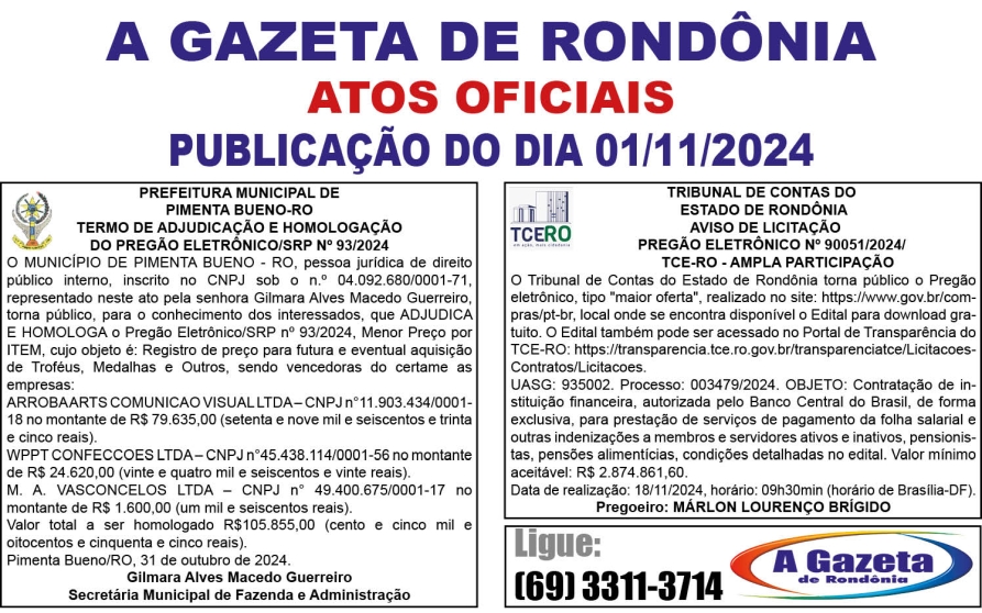 A GAZETA DE RONDÔNIA ATOS OFICIAIS PUBLICAÇÃO DO DIA 01/11/2024 Por Diretor Chefe 31 de outubro de 2024 às 16h36