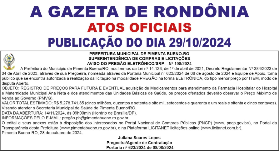 A GAZETA DE RONDÔNIA ATOS OFICIAIS PUBLICAÇÃO DO DIA 29/10/2024 Por Diretor Chefe 28 de outubro de 2024 às 16h24