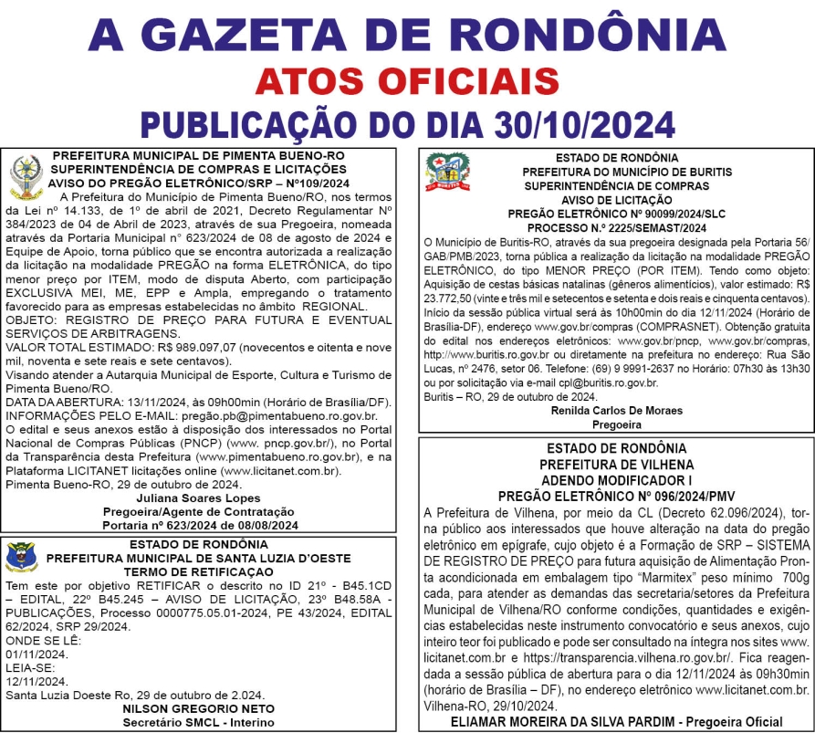 A GAZETA DE RONDÔNIA ATOS OFICIAIS PUBLICAÇÃO DO DIA 30/10/2024 Por Diretor Chefe 29 de outubro de 2024 às 16h28