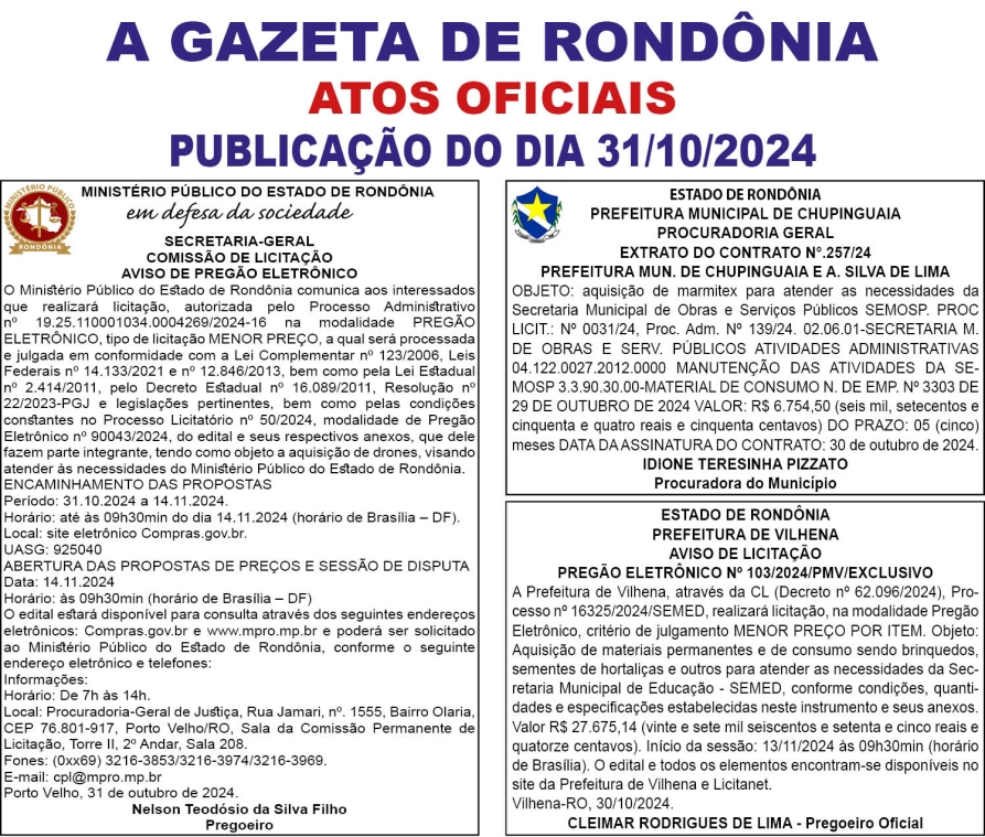 A GAZETA DE RONDÔNIA ATOS OFICIAIS PUBLICAÇÃO DO DIA 31/10/2024 Por Diretor Chefe 30 de outubro de 2024 às 16h42