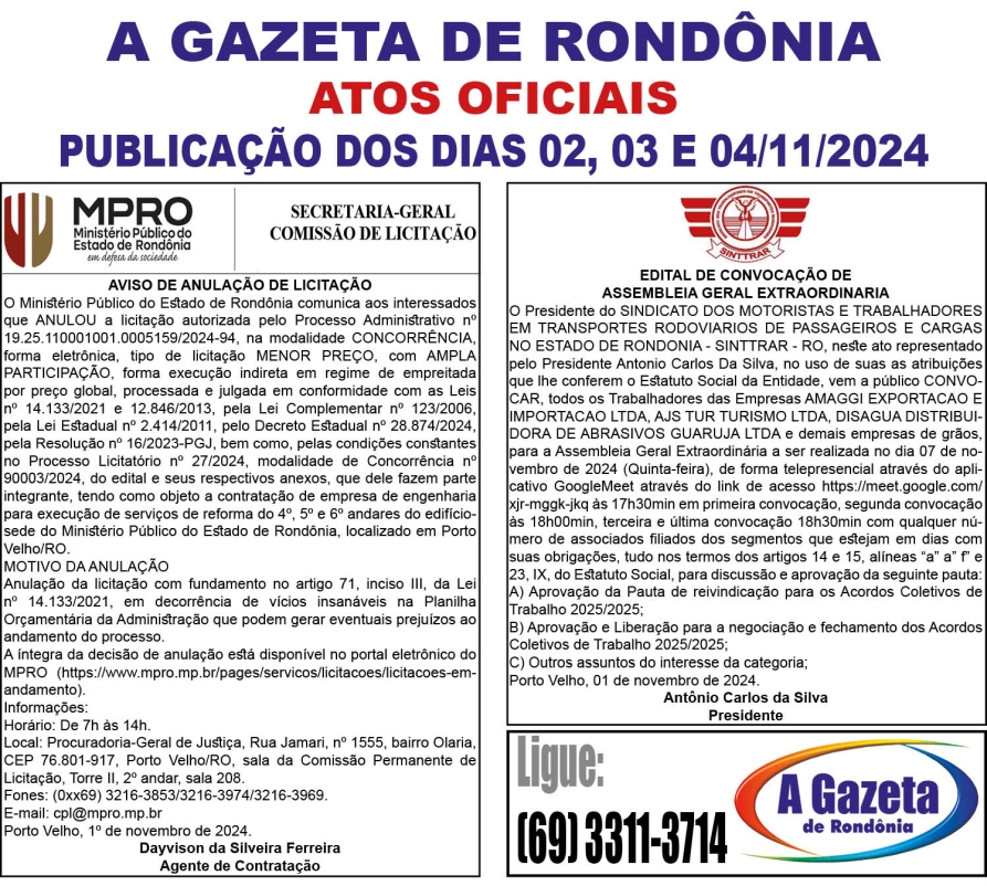 A GAZETA DE RONDÔNIA ATOS OFICIAIS PUBLICAÇÃO DOS DIAS 02, 03 E 04/11/2024 Por Diretor Chefe 1 de novembro de 2024 às 16h38
