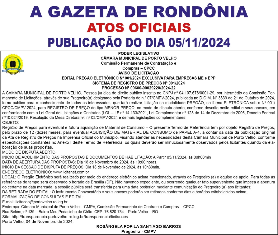 A GAZETA DE RONDÔNIA ATOS OFICIAIS PUBLICAÇÃO DO DIA 05/11/2024 Por Diretor Chefe 4 de novembro de 2024 às 17h06