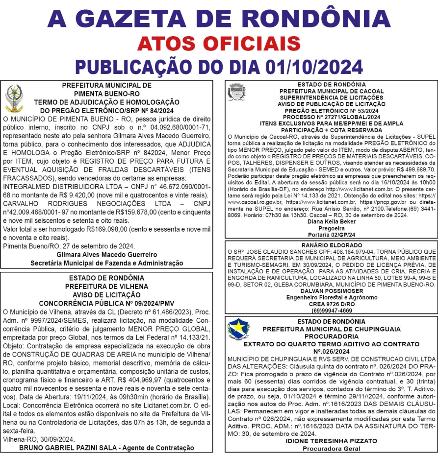 A GAZETA DE RONDÔNIA ATOS OFICIAIS PUBLICAÇÃO DO DIA 01/10/2024 Por Diretor Chefe 30 de setembro de 2024 às 16h53