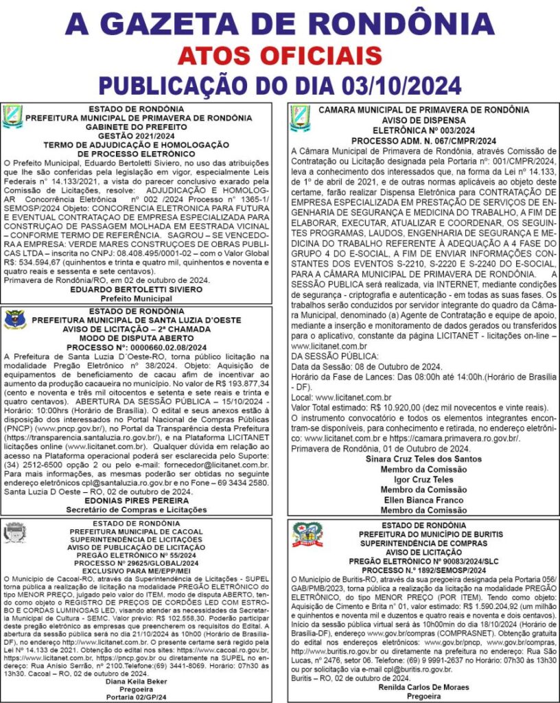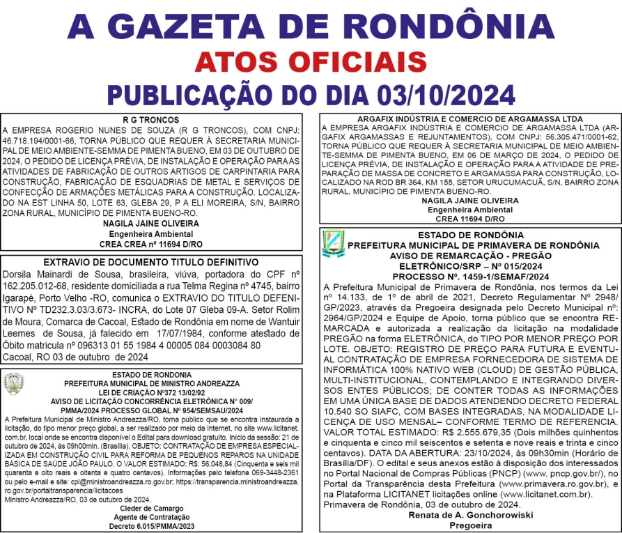 A GAZETA DE RONDÔNIA ATOS OFICIAIS PUBLICAÇÃO DO DIA 03/10/2024 Por Diretor Chefe 2 de outubro de 2024 às 16h30