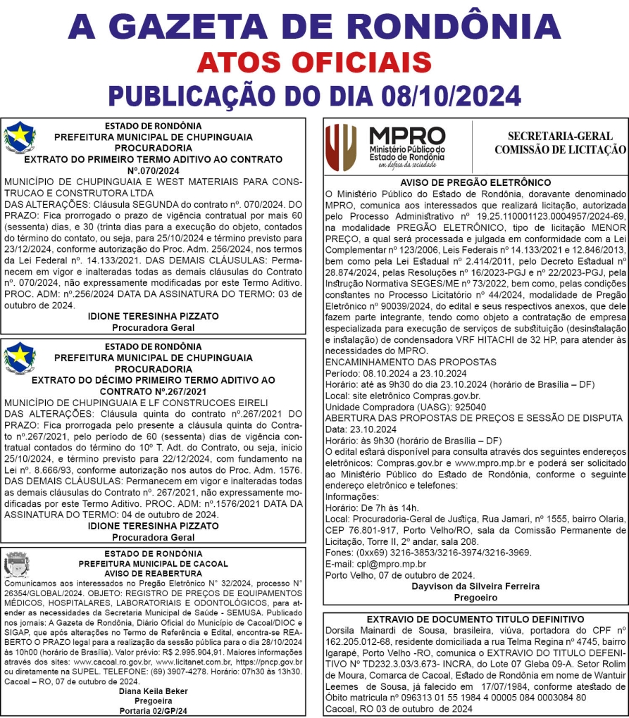 A GAZETA DE RONDÔNIA ATOS OFICIAIS PUBLICAÇÃO DO DIA 08/10/2024 Por Diretor Chefe 7 de outubro de 2024 às 16h47