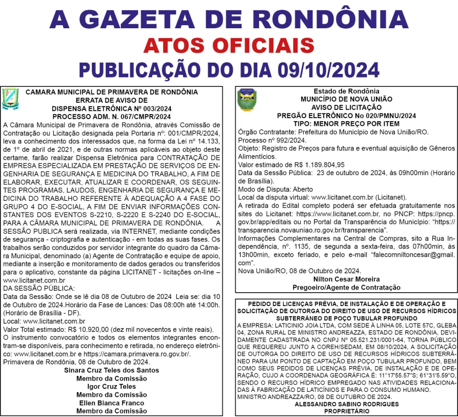A GAZETA DE RONDÔNIA ATOS OFICIAIS PUBLICAÇÃO DO DIA 09/10/2024 Por Diretor Chefe 8 de outubro de 2024 às 16h40
