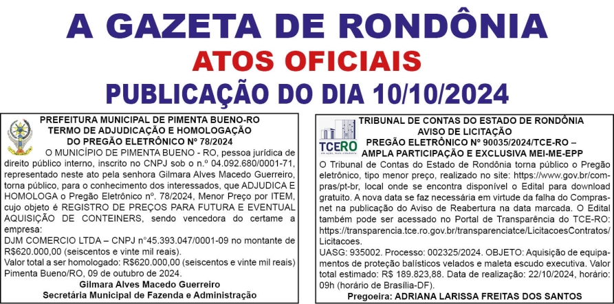A GAZETA DE RONDÔNIA ATOS OFICIAIS PUBLICAÇÃO DOS DIAS 12, 13 E 14/10/2024 Por Diretor Chefe 11 de outubro de 2024 às 16h08