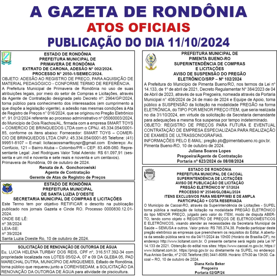 A GAZETA DE RONDÔNIA ATOS OFICIAIS PUBLICAÇÃO DO DIA 11/10/2024 Por Diretor Chefe 11 de outubro de 2024 às 09h13