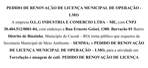 PEDIDO DE RENOVAÇÃO DE LICENÇA MUNICIPAL DE OPERAÇÃO – LMO O.L.G INDUSTRIA E COMERCIO LTDA – ME Por Diretor Chefe 27 de novembro de 2025 às 15h36