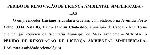PEDIDO DE RENOVAÇÃO DE LICENÇA AMBIENTAL SIMPLIFICADA-LAS – LUCIANO ALCÂNTARA GUERRA Por Diretor Chefe 25 de novembro de 2025 às 08h29