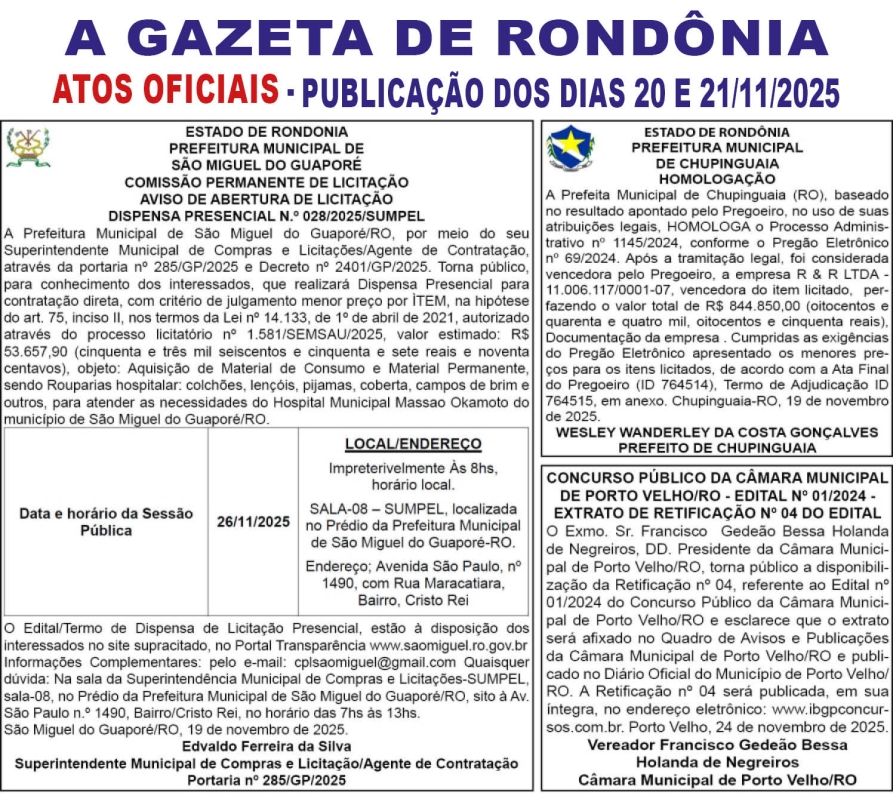 A GAZETA DE RONDÔNIA ATOS OFICIAIS PUBLICAÇÃO DOS DIAS 20 E 21/11/2025 Por Diretor Chefe 20 de novembro de 2025 às 22h35