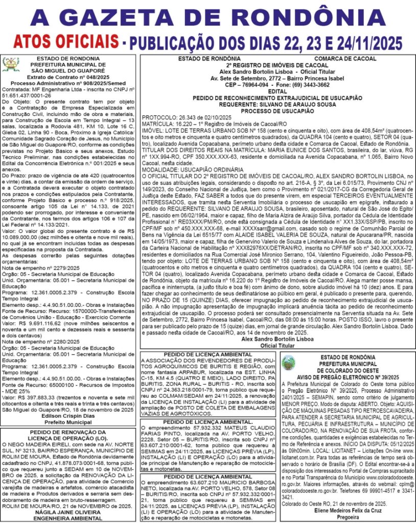 A GAZETA DE RONDÔNIA ATOS OFICIAIS PUBLICAÇÃO DOS DIAS 22, 23 E 24/11/2025 Por Diretor Chefe 21 de novembro de 2025 às 22h37