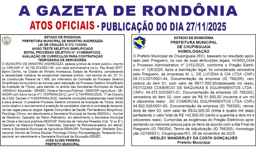 A GAZETA DE RONDÔNIA ATOS OFICIAIS PUBLICAÇÃO DO DIA 27/11/2025 Por Diretor Chefe 26 de novembro de 2025 às 22h42
