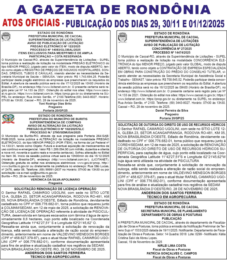 A GAZETA DE RONDÔNIA ATOS OFICIAIS PUBLICAÇÃO DOS DIAS 29, 30/11 E 01/12/2025 Por Diretor Chefe 28 de novembro de 2025 às 22h45