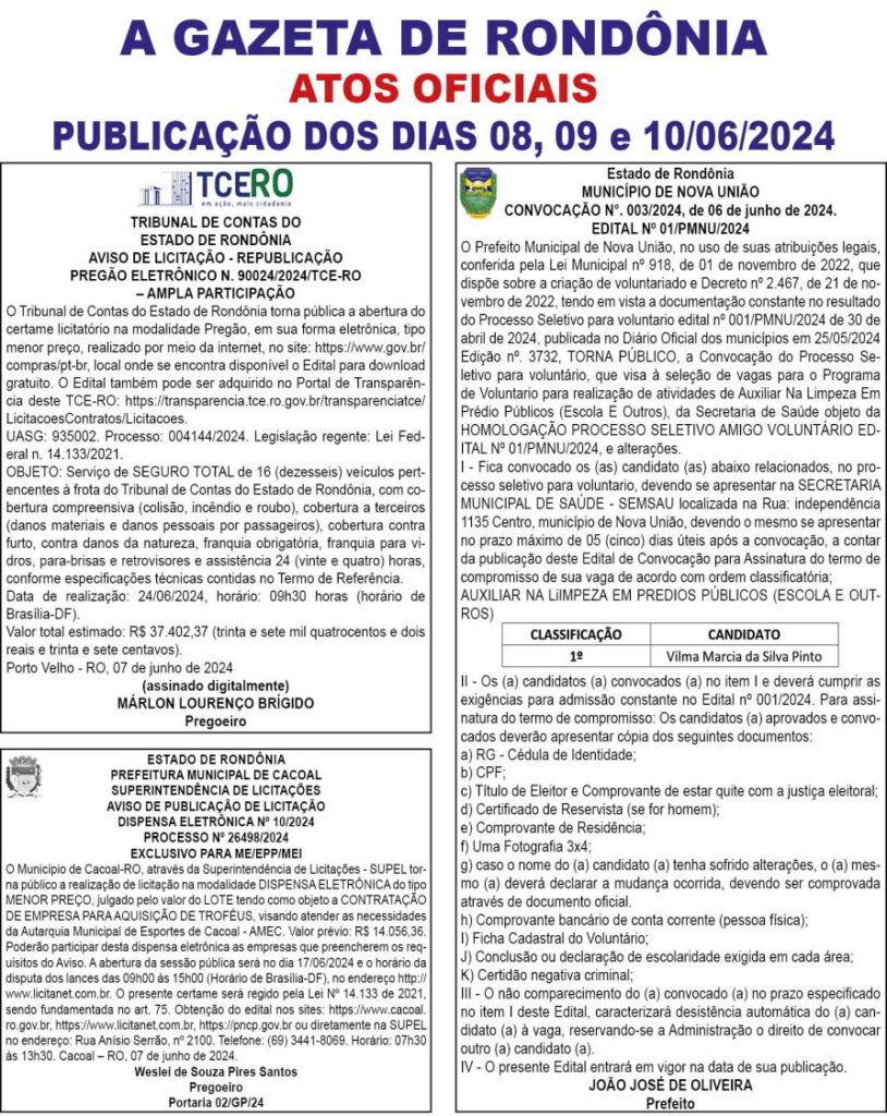 A GAZETA DE RONDÔNIA ATOS OFICIAIS PUBLICAÇÃO DOS DIAS 08, 09 e 10/06/2024 Por Diretor Chefe 7 de junho de 2024 às 16h51