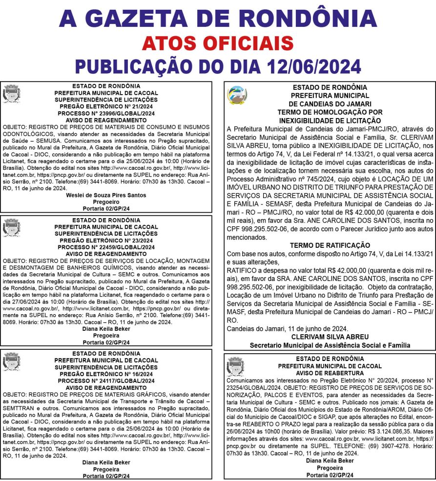 A GAZETA DE RONDÔNIA ATOS OFICIAIS PUBLICAÇÃO DO DIA 12/06/2024 Por Diretor Chefe 11 de junho de 2024 às 16h52