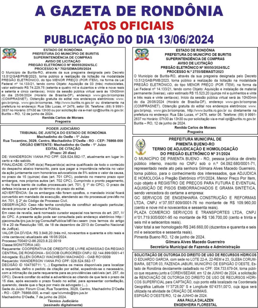 A GAZETA DE RONDÔNIA ATOS OFICIAIS PUBLICAÇÃO DO DIA 13/06/2024 Por Diretor Chefe 12 de junho de 2024 às 19h35