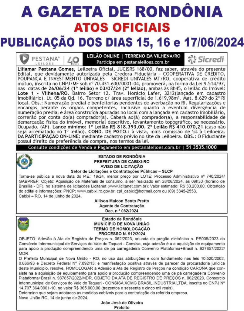 A GAZETA DE RONDÔNIA ATOS OFICIAIS PUBLICAÇÃO DOS DIAS 15, 16 e 17/06/2024 Por Diretor Chefe 14 de junho de 2024 às 16h50