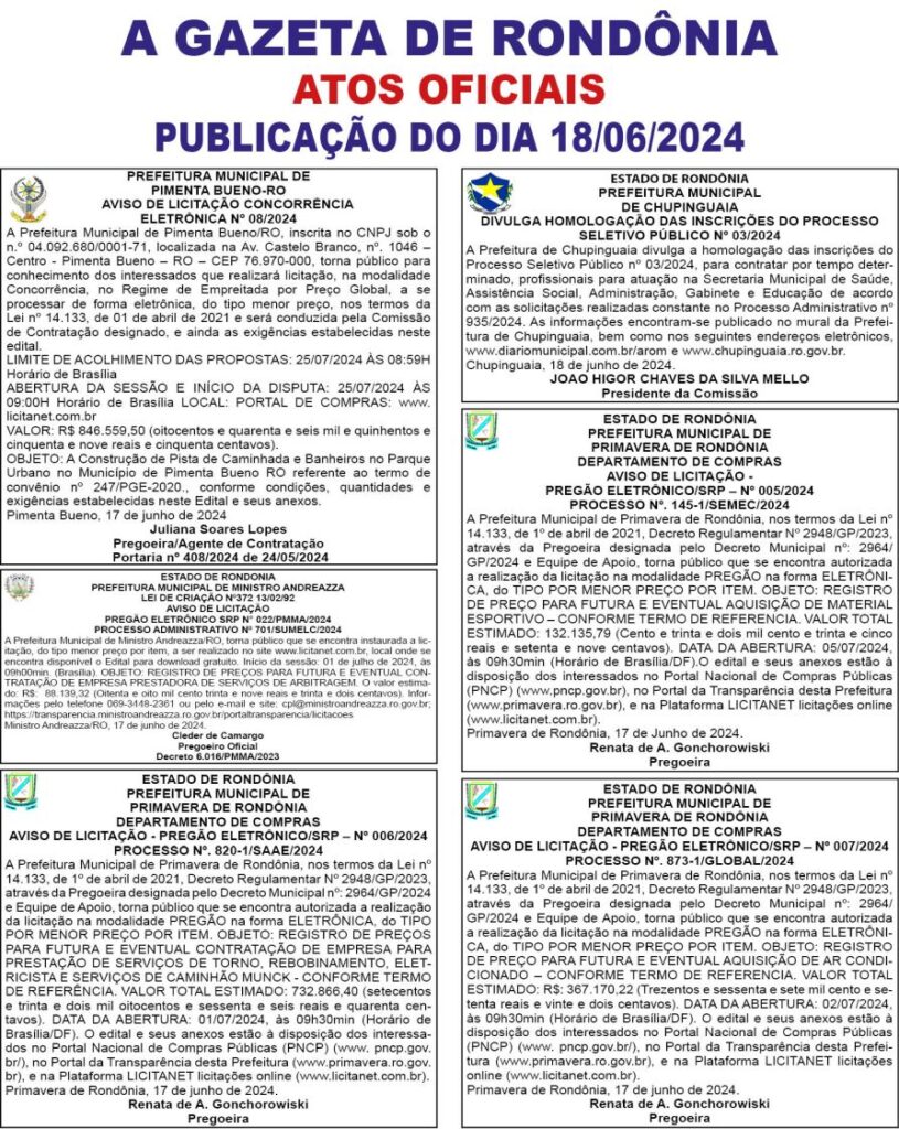 A GAZETA DE RONDÔNIA ATOS OFICIAIS PUBLICAÇÃO DO DIA 18/06/2024 Por Diretor Chefe 17 de junho de 2024 às 16h42
