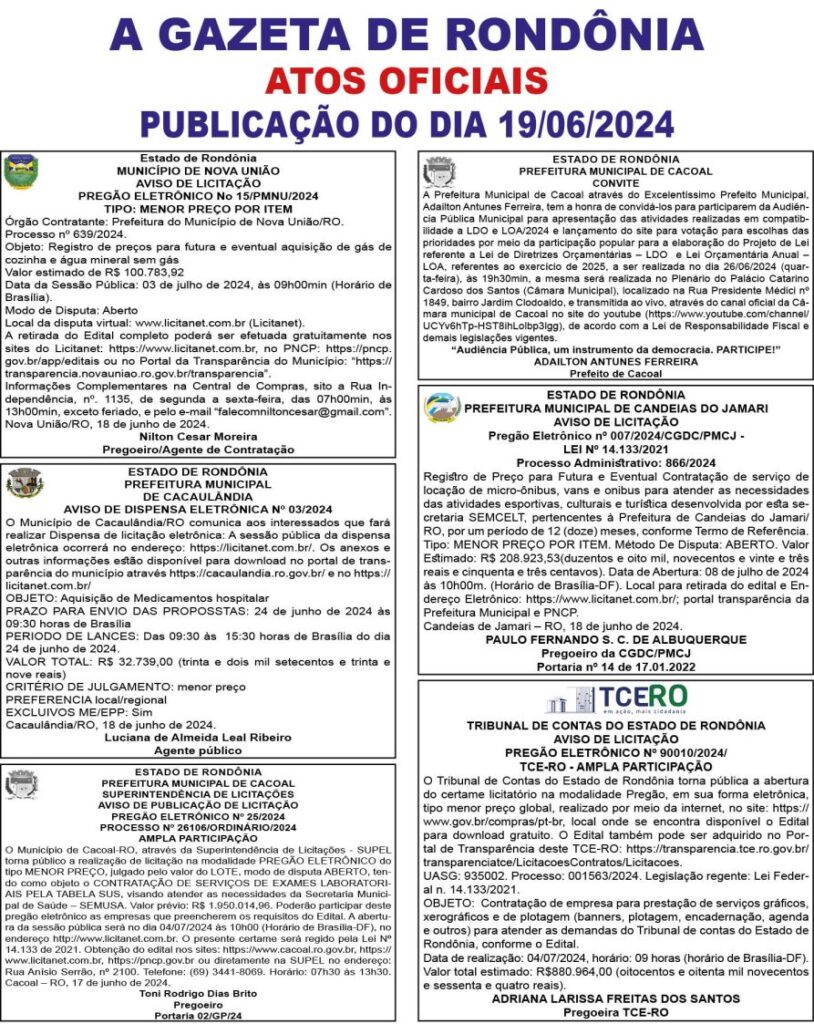 A GAZETA DE RONDÔNIA ATOS OFICIAIS PUBLICAÇÃO DO DIA 19/06/2024 Por Diretor Chefe 19 de junho de 2024 às 02h30