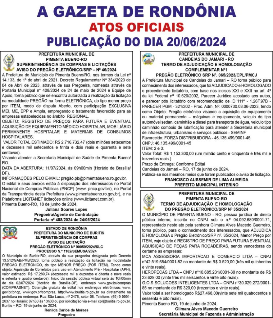 A GAZETA DE RONDÔNIA ATOS OFICIAIS PUBLICAÇÃO DO DIA 20/06/2024 Por Diretor Chefe 19 de junho de 2024 às 16h53