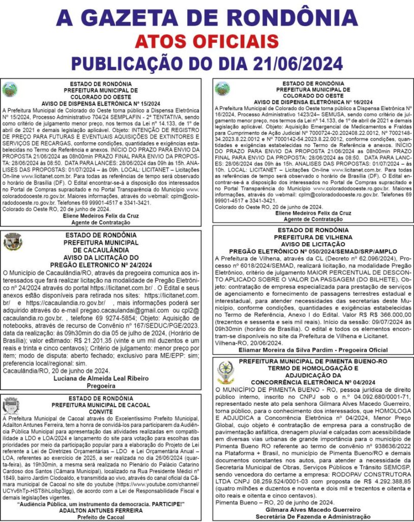A GAZETA DE RONDÔNIA ATOS OFICIAIS PUBLICAÇÃO DO DIA 21/06/2024 Por Diretor Chefe 20 de junho de 2024 às 16h59