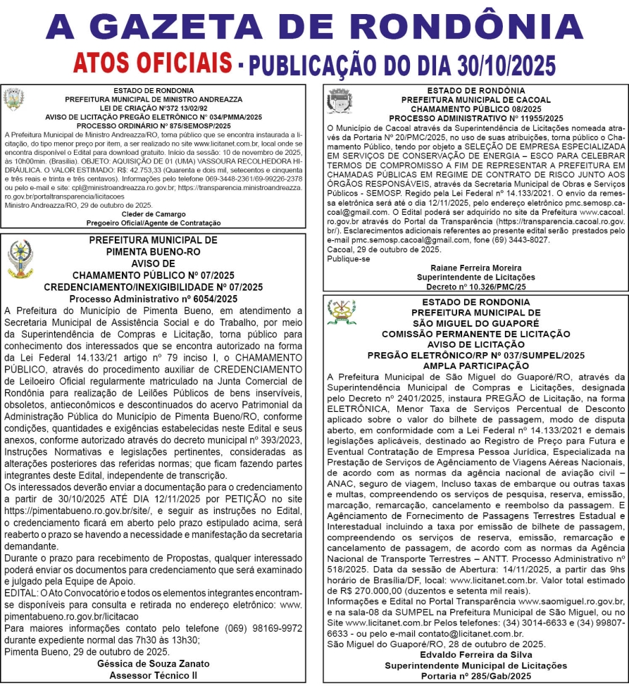 A GAZETA DE RONDÔNIA ATOS OFICIAIS PUBLICAÇÃO DO DIA 30/10/2025 Por Diretor Chefe 29 de outubro de 2025 às 17h23