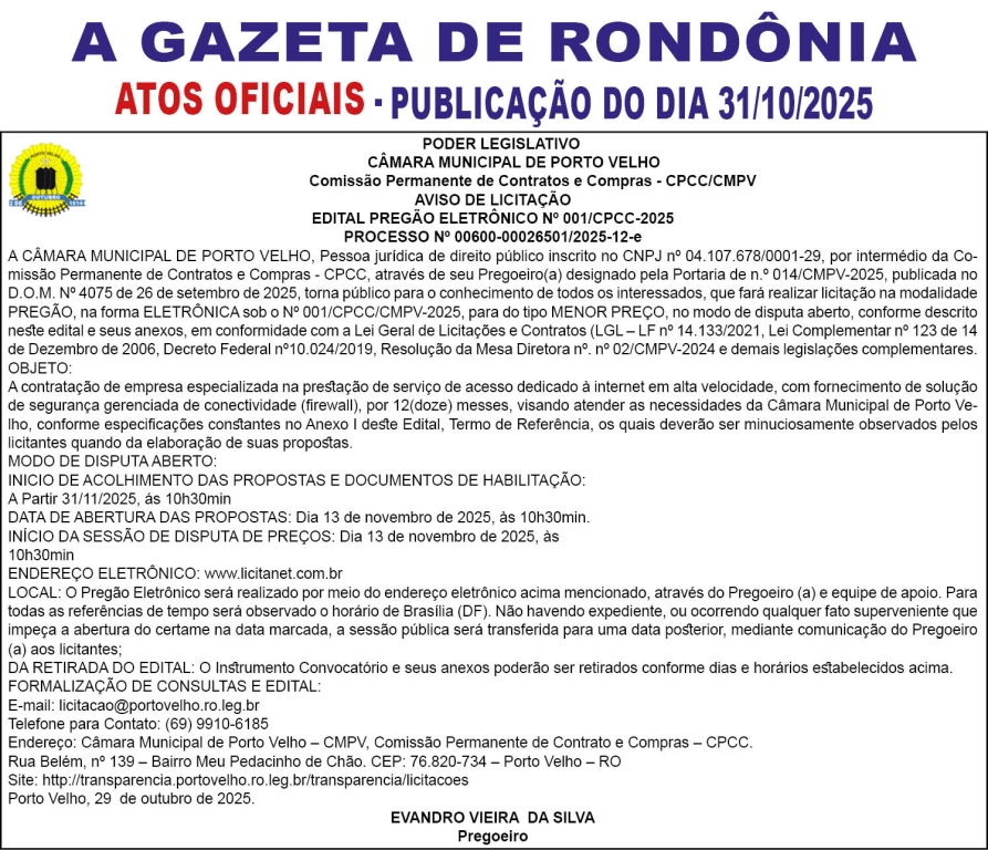 A GAZETA DE RONDÔNIA ATOS OFICIAIS PUBLICAÇÃO DO DIA 31/10/2025 Por Diretor Chefe 30 de outubro de 2025 às 17h46