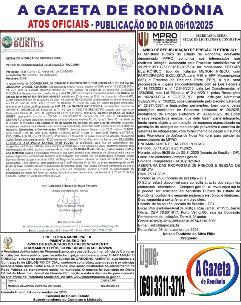 A GAZETA DE RONDÔNIA ATOS OFICIAIS PUBLICAÇÃO DO DIA 06/11/2025 Por Diretor Chefe 5 de novembro de 2025 às 18h10