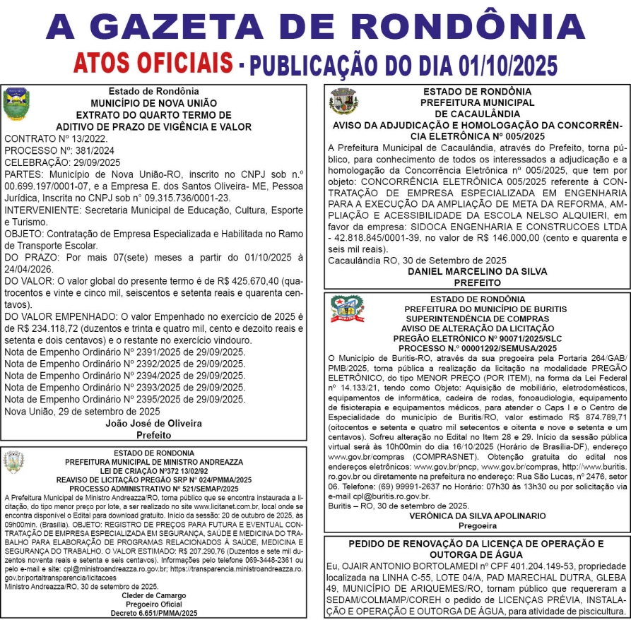 A GAZETA DE RONDÔNIA ATOS OFICIAIS PUBLICAÇÃO DO DIA 01/10/2025 Por Diretor Chefe 30 de setembro de 2025 às 19h58