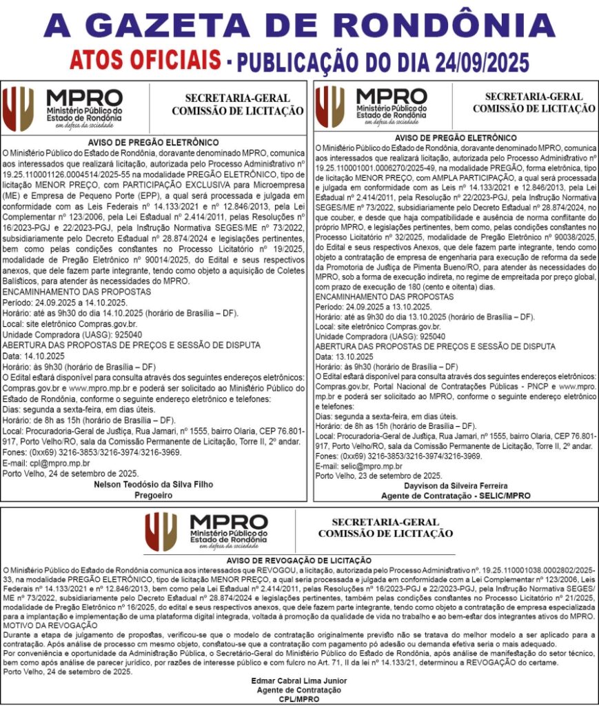 A GAZETA DE RONDÔNIA ATOS OFICIAIS PUBLICAÇÃO DO DIA 24/09/2025 Por Diretor Chefe 23 de setembro de 2025 às 18h07