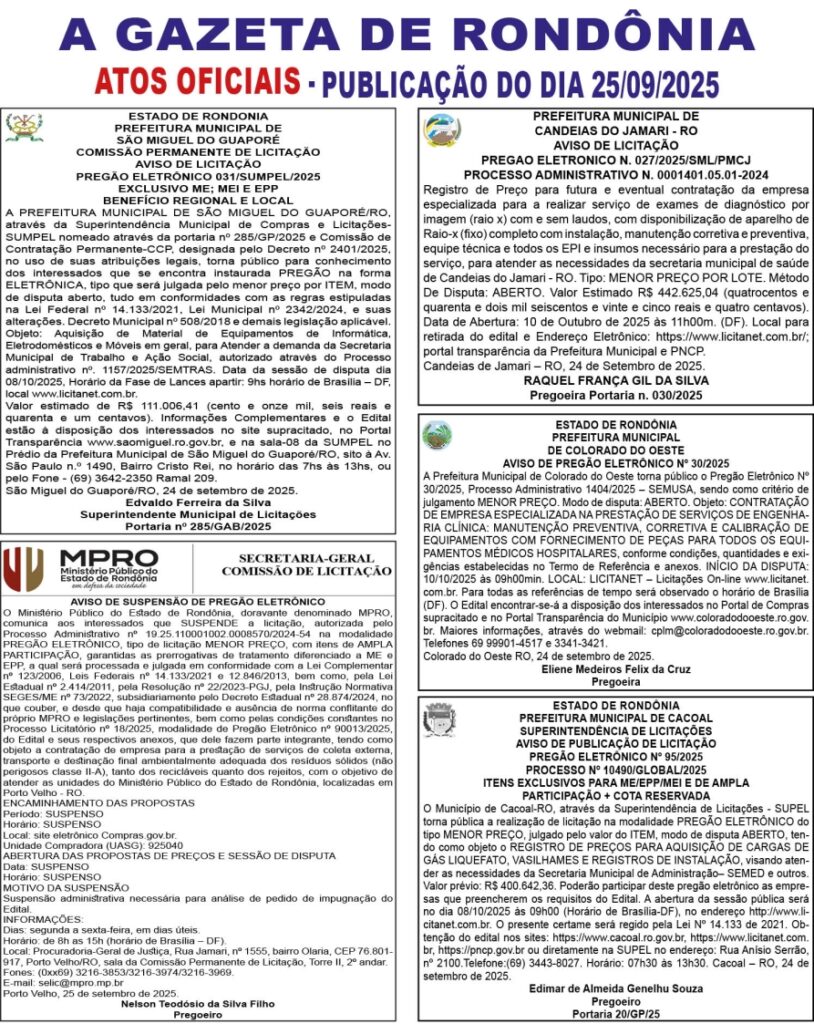 A GAZETA DE RONDÔNIA ATOS OFICIAIS PUBLICAÇÃO DO DIA 25/09/2025 Por Diretor Chefe 24 de setembro de 2025 às 18h08